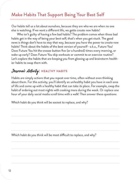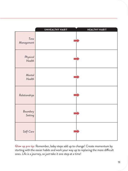 From beauty and style to career goals, investing in yourself, and fitness, you’ll brainstorm what exactly you want to get out of your glow up. With fun prompts like Main Character Energy Daily, Mix n’ Match the Best Workout Routine, and more, you’ll romanticize the process of glowing up and get excited to meet all your goals. Then, you’ll track your progress with daily check-ins. Yo